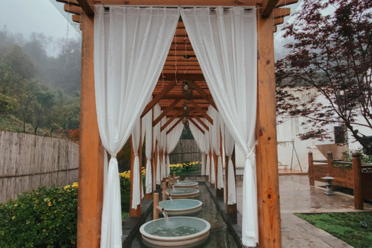 室外庭院错落有致,各种绿植贯穿其中,露天温泉被山石环绕,曲径通幽。三步一景,五步一池,雾气缥缈间,相映成趣,颇有一种古色古香的氛围感,俨然一副中式山水画。伴随着大自然的气息,听着水流声,生活里的疲惫也随着不断升起的水雾烟消云散。
