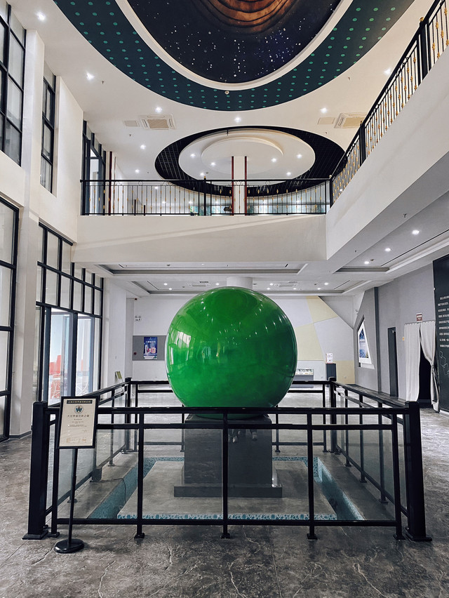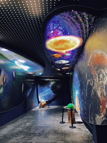 在宇宙世界展厅中利用光影技术,将各色的萤石夜明珠组成了一个“太阳系”,通过光影变幻让人有一种置身在宇宙浩瀚星空中的感觉。