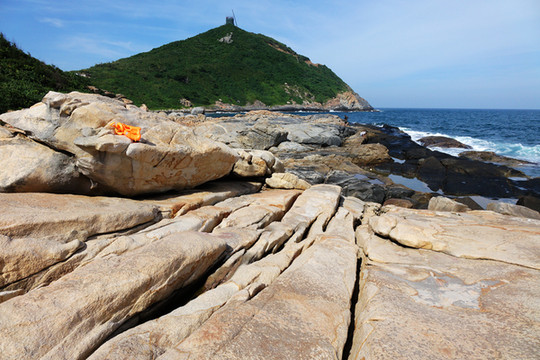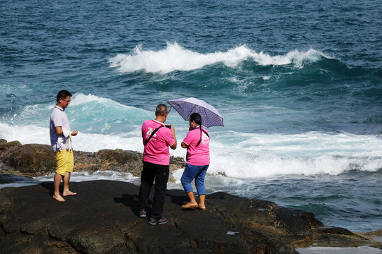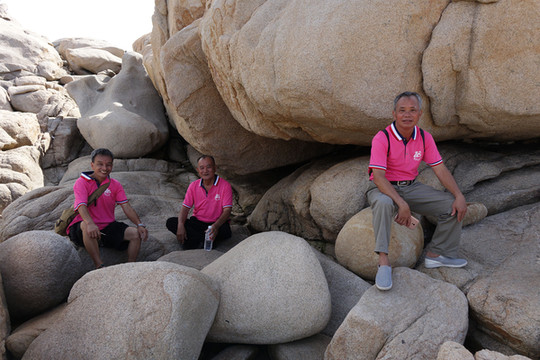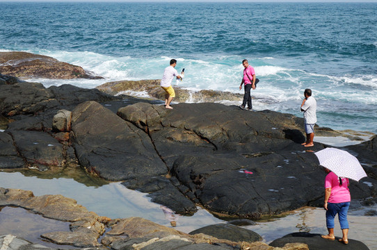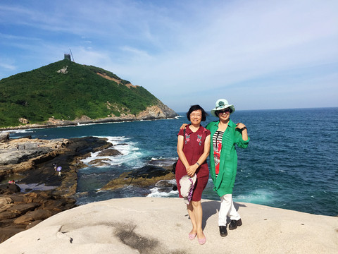 还在中俄边境自驾时,就听玉儿一次次地向我推荐铜鼓岭的石头公园,说我一定喜欢,让我身未动心已远,对那里充满期待。当我们来到石头公园,见到面临蔚蓝色大海前一块块形态各异的巨大礁石时,真的为之震撼!这是在轮船上在沙滩上眺望大海完全不同的感觉!你能真切地感受到大海的力量,大自然的鬼斧神工!数万年的造山运动隆起地面的石头,经过漫长岁月潮汐的拍打冲刷和侵蚀而形成了海蚀地貌,造就了如此气势磅礴的景色!山脚下怪石嶙峋,汹涌的海浪一阵阵扑过去,勇敢的陈炳业和蔡秀云同学竟然跑到了礁石上,直面大海的波涛。我抓拍到这一幕。