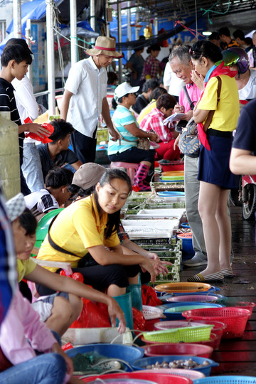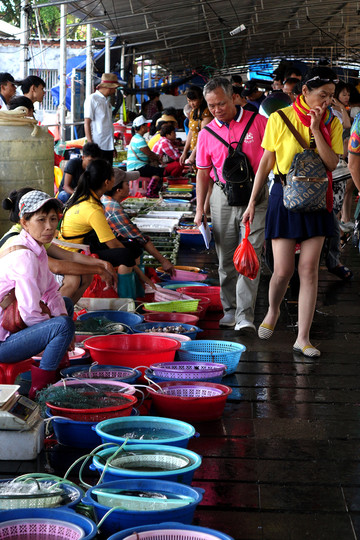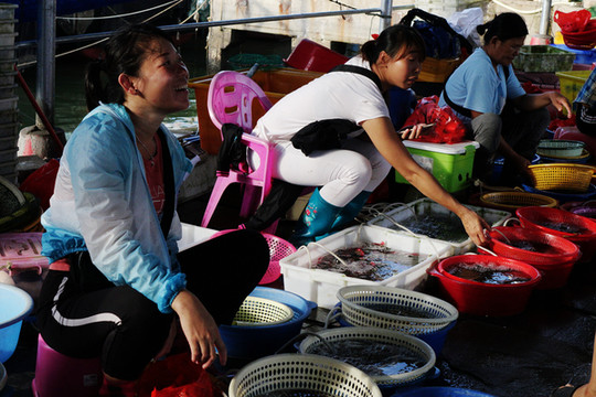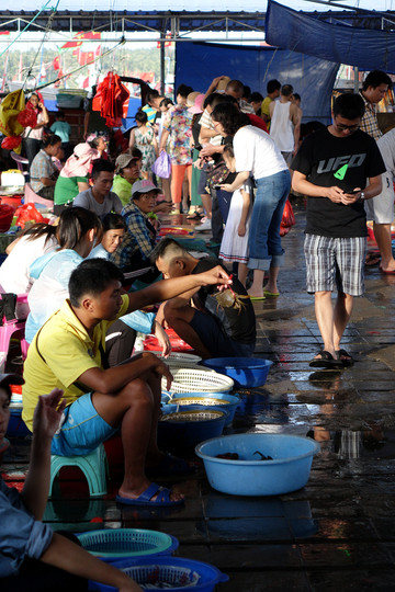 尽管今年的休渔期延长到8月15日,但丝毫没有减少码头上海鲜的叫卖和前来饭店品尝海鲜的游客。海鲜市场人头涌涌,颜色各异的小水盆排在两侧,将行人道挤的几乎没有空间。空气中充斥着咸咸的海腥味,地面上湿漉漉的,水盆里有见过的没见过的各种海鲜,让人看得眼花撩乱。