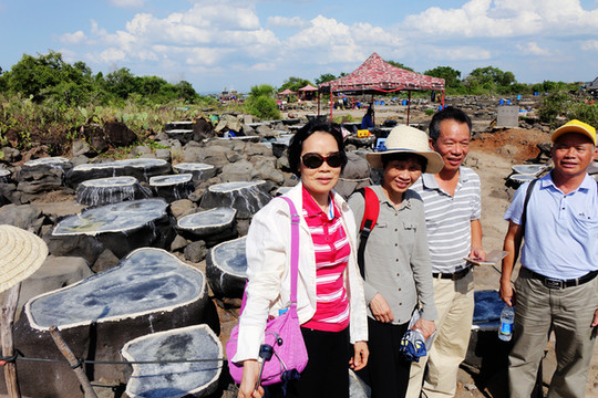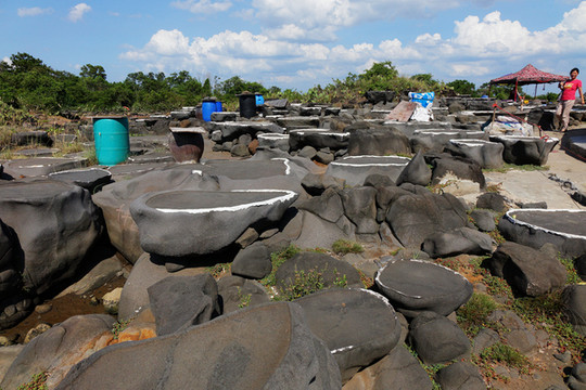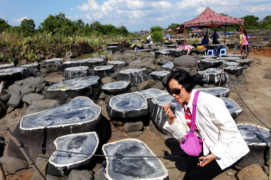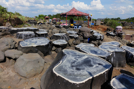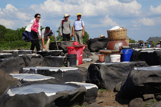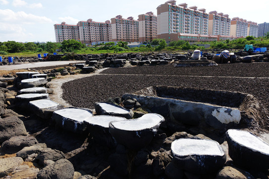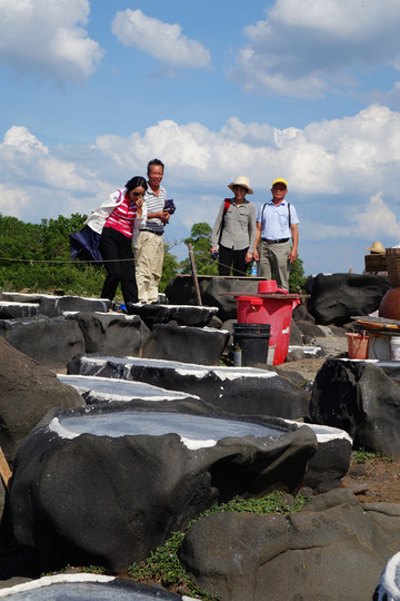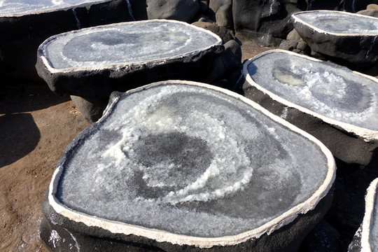 一走进古盐田,我们就被那些大大小小散落的、灰黑色的、像一方方砚台错落分布在一垄垄的盐田周围的石槽吸引了眼球。原来盐还可以这样晒!据说这些石槽有些是唐朝时期保留下来的,已有数千年历史。这些石槽是用玄武石(火山石)打造的,边缘凸起,里面凹入的水槽,类似盛水的盘子。槽很浅,据说只是一天的晒盐量。有些石槽已盛满卤水,结晶的盐体正慢慢析出;有的石槽边缘残留着白色的盐,勾勒出石槽的轮廓。这与我们概念中的海边修建盐田日晒盐完全不同,它的独特就在于那些一个个砚台式的石槽。