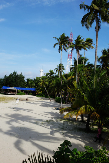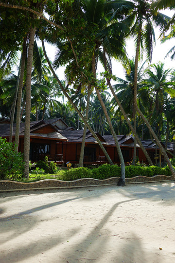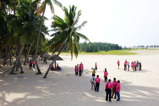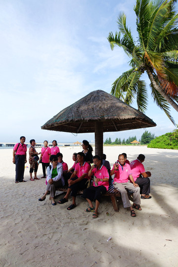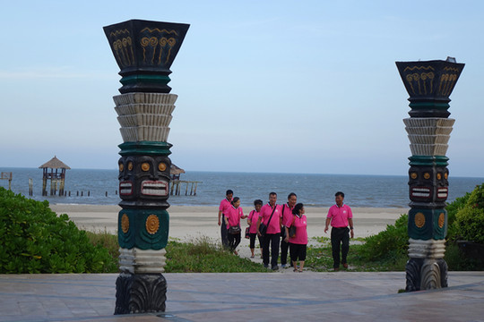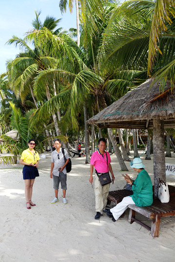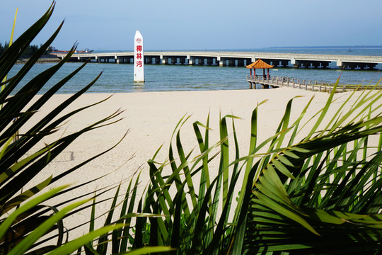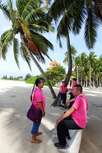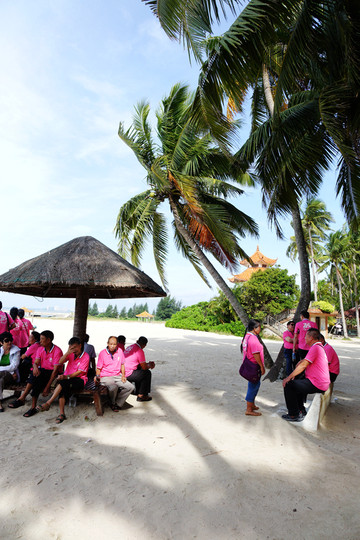 第二天开始了文昌游览行程。第一站是著名的【东郊椰林】,它位于文昌市东郊镇海滨。这是一片面朝大海的椰树林,椰树成片,椰姿百态,椰风树影,被人描述“文昌椰子半海南,东郊椰林最风光”。站在瞭望台上眺望,“椰林湾”的牌子矗立在海水之中,白色沙滩上三三两两穿着粉红色T恤的同学们,让宁静的沙滩热闹起来。当见到椰林中掩映着一排排小木屋,心里在想,什么时候也能够来到这里度过一个悠闲的假期?