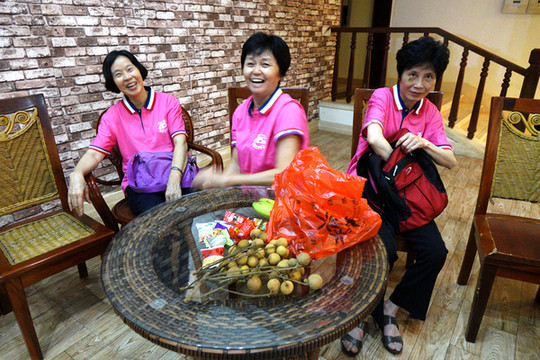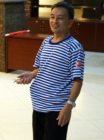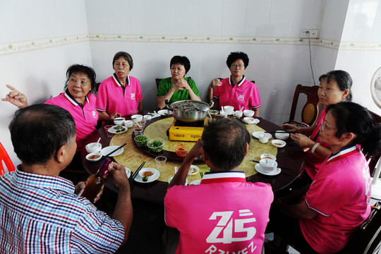 在大家坐在餐厅里喝茶消暑时,周永华和英洁同学亲自前往市场为大家选购海鲜,既要让大家吃好又要控制预算,真是难为他们。