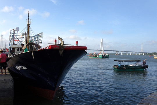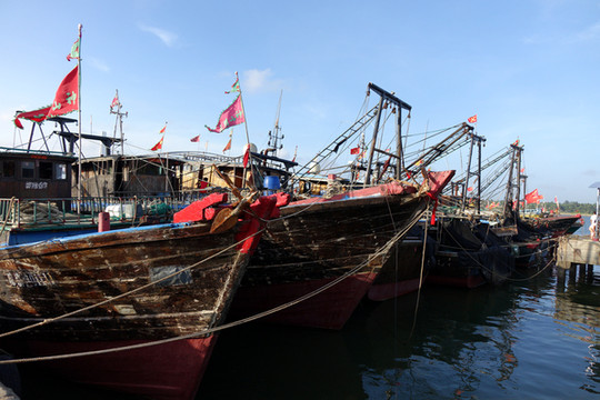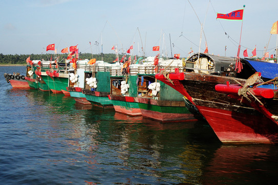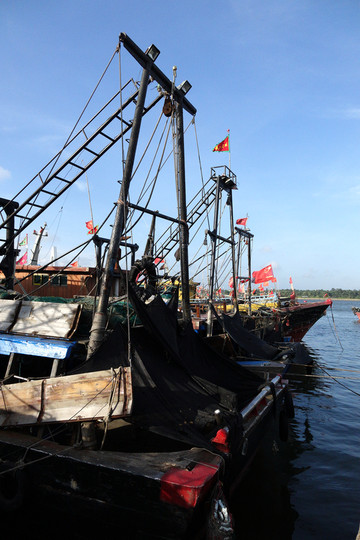码头上停泊了无数艘大大小小的渔船,有的船上还有渔民正在作业。
