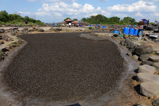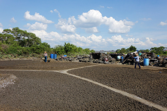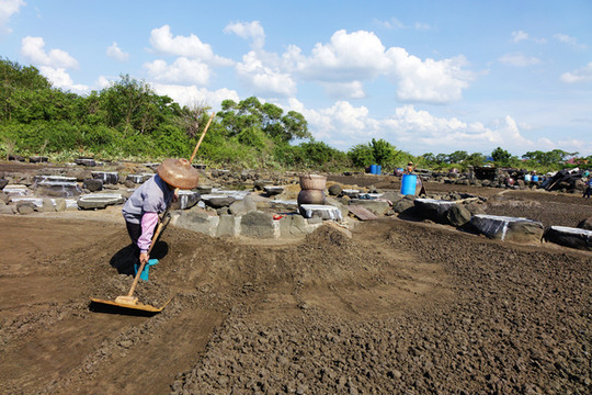 盐田里还有一块块的泥巴地,见到两个盐田妇女在那里用木制钉耙把泥巴翻起、打碎。我们了解到这是晒盐的第一步,目的是使盐泥浸入更多的盐分。待潮起时海水淹没这些疏松的泥巴,潮水退后将这些盐泥反复晒几日,并不断用钉耙翻动。第二个步就是将这些含盐很高晒干的盐泥,搬运到旁边的盐池里,盐池是经过特殊加工的,底部铺有过滤用的细密茅草?子。第三步,将蓄海水慢慢不停倒入盐池,浸泡在盐泥上的海水就慢慢过滤到盐卤水池。第四步,当这些卤水的含盐量达到一定的浓度后,再将这些卤水盛进一个挨着一个的石槽,在极为强烈的阳光下暴晒,当水分完全消失,石槽里剩下的就是盐了。第五步就是收盐了。