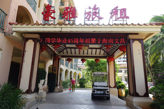 豪雅酒店在电子屏上滚动显示着“热烈欢迎(热作两院附中)同学毕业45周年相聚于海南文昌豪雅”,在大堂的正后方挂上“热作两院附中同学毕业45周年相聚”的横幅,让每一位参加聚会的同学刚到达就感受到浓浓的同学情。