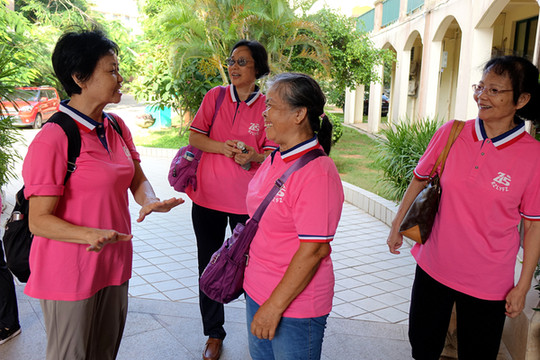 聚会合影是聚会的重头戏,当同学们穿上筹备小组提前为大家准备的桃红色T恤时,整齐划一的颜色,靓丽了每一个人的脸庞,仿佛立刻年轻了十岁!因为同学到达时间不一,合影竟然进行了三次!从10号的下午到11号的早上,每一次都增加了几个人,留下了45年后重聚首的难忘瞬间!
