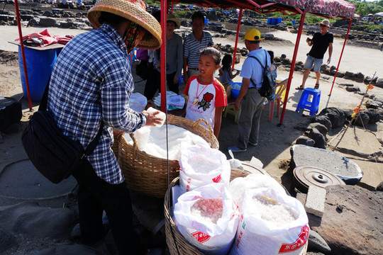 这里所产的盐巴白如雪,细如棉,纯净天然,不带杂质,用舌头舔舔,咸味纯正。因为没有加“碘”所以只允许在现场卖。那些存放时间越久的老盐越贵,15年的盐要18元一斤。周永华同学一口气买了十斤!说是老盐可以治病。