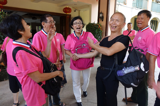 聚会报到时间一直持续着,每一位同学的到来都引起了同学们小小的雀跃,特别是中学毕业后几十年未见的同学,没有参加上次聚会的同学。大家热切相拥,不由自主地回忆过去的时光。记得李大成见到曾和平时,两个人从上到下互相打量着,我听到大成说了两遍:和平的样子虽有改变,但说话的语气神态还是几十年前那个样!蔡秀云同学拉着我问是否还认得她,这位初中毕业再也没见过的同学,简直就是儿时蔡秀云的老年翻版!当林丽芳见到梁建中同学时,大声地笑着说,大家都说你是我的老情人!
