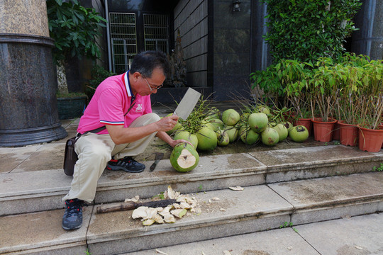 范同学父母亲为我们准备了一大盆糯香可口的芋头和刚摘下来的一堆青椰子。我们迫不及待地抓起来就吃,久违了又香又粉的家乡小芋头让每个人都赞不绝口!张远周同学亲自为我们砍椰子,清甜的椰子水沁人心脾,为炎热的夏日带来一股清爽。