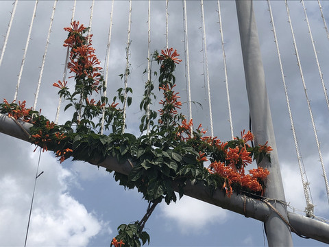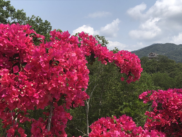 过了神玉书院的牌坊不远,便走上了水坝。水坝上有一座桥,远看式样普通,近看却很漂亮。桥栏是白色的,远离水面一侧的桥栏上种植了许多藤蔓,以三角梅为主,还有一些炮仗花。两种花都进入盛花期的季节,开得十分绚烂。靠近水面一侧的桥栏上没有种花,这样可以保证良好的视野,让游客观赏湖光山色。