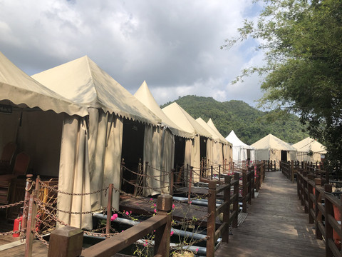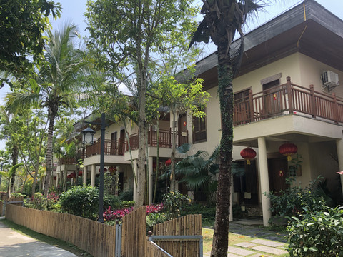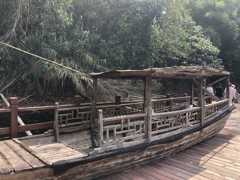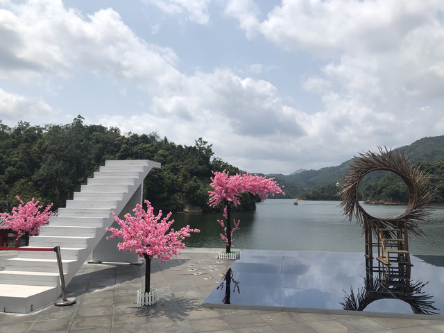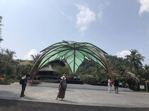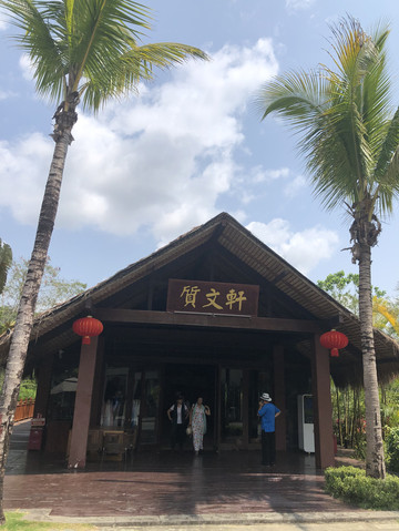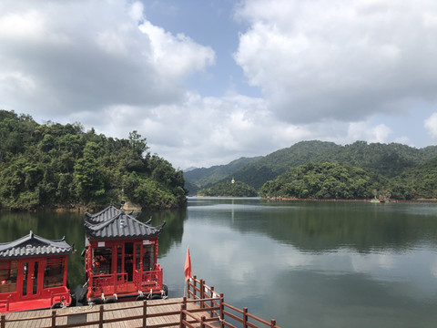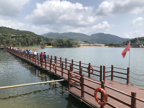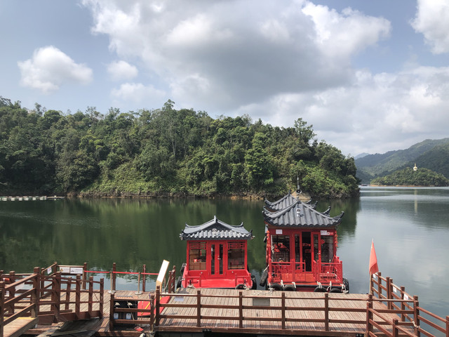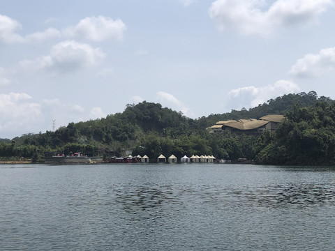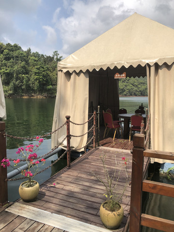 游船码头还要从这里左转再步行一段路。路边有几个好像简易帐篷似的东西,是餐厅的包厢。整座餐厅都漂浮在水上。临水而坐,观赏着湖光山色用餐,很是惬意。推荐这里黎族特色的簸箕宴。
