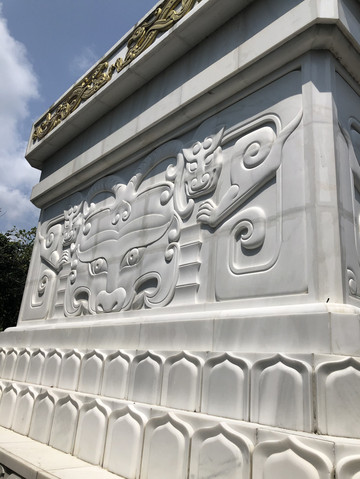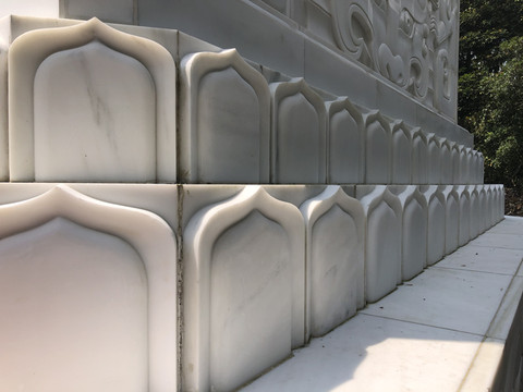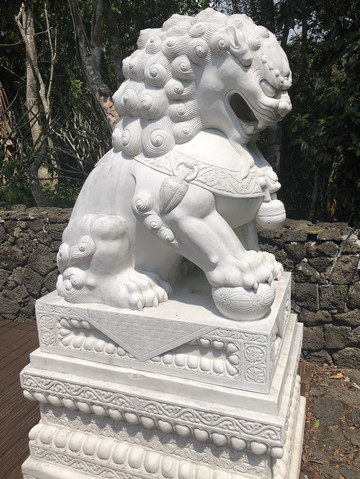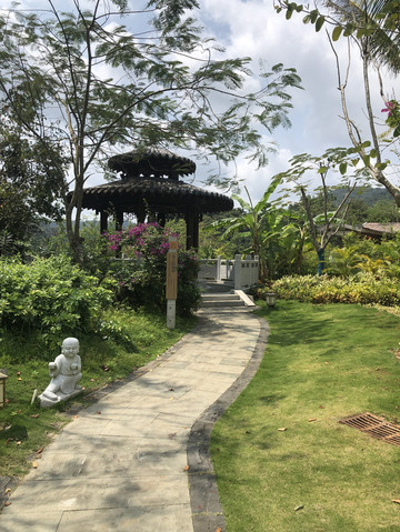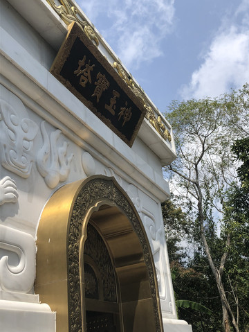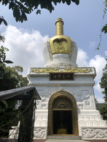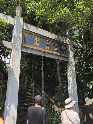 在观音岛码头登岸,可以沿着栈道观赏景区风光。第一站是神玉宝塔。景点的入口处是观音岛的牌坊。宝塔神似北京的北海白塔。汉白玉雕筑,塔尖和佛像有金饰,塔座的大门有铜饰。据导游介绍,这是采自四川丹巴的高级汉白玉,半透明,有晶莹剔透之感。最神奇的是,这种玉冬暖夏凉。在海南强烈的阳光下曝晒几个小时,摸上去仍然是凉的。塔内有从北京请来的观音像。宝塔旁边有两座小石狮子,也是用汉白玉雕成,不过玉的成色明显不好,看上去更像普通的石头。不是半透明,在阳光下曝晒会烫手。
