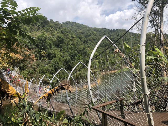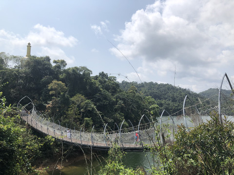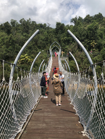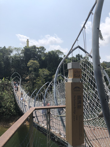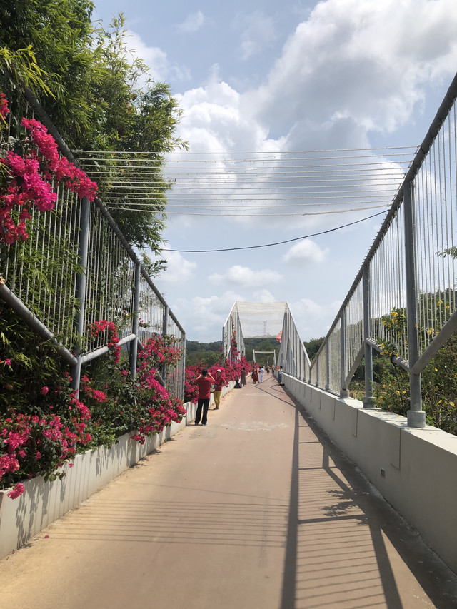 继续向前,便来到了刚刚在游船上看到的吊桥,叫做圆满桥。大概是取功德圆满之意。桥的形状好似一片片莲花瓣穿连在一起。桥很坚固,许多人走在上面也没有多大的晃动。这里成为游客打卡的热门地点。过桥后回头拍照,可以把吊桥和白塔拍在一张照片中。