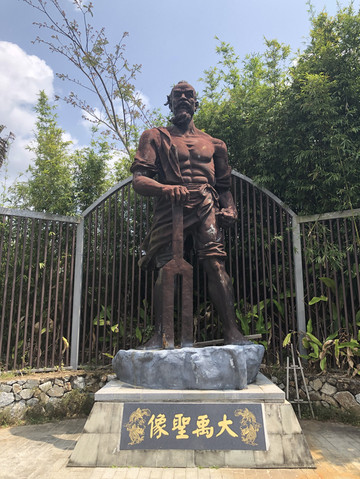 从游客中心再步行一小段路,便来到了观景平台。这里的风景优美,山清水秀。山是绿色的,水也是绿色的。整个景区仿佛一大块碧玉镶嵌在群山之中。远远地可以看到神玉岛和观音岛,观音岛上有一座白塔,样式很像北京北海公园的那座。小岛间有栈道相连,一直通到堤坝上。岸边停着几艘红色的仿古式样的游船。小岛、白塔、栈道、游船,组成一幅美丽的图画。观景台还设计了可供游人拍照的设施。这里还有一尊大禹像,不知道什么来历。