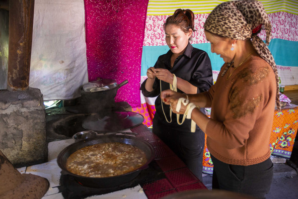 就餐,哈萨克牧民家中,热情好客。这种做法的面食好像加拉条子?