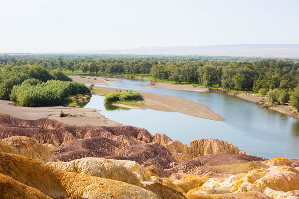它毗邻碧波荡漾的额尔齐斯河,与对岸葱郁青翠的河谷风光遥相辉映,可谓“一河隔两岸,自有两重天”。河岸岩层抗风化能力强弱不一,轮廓便会参差不齐,而岩石含有矿物质的不同,又幻化出种种