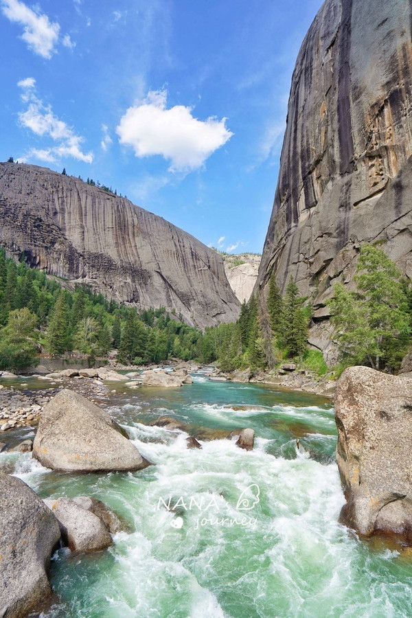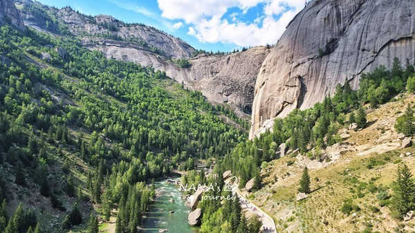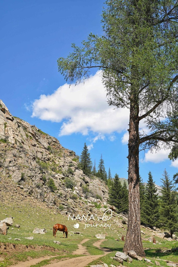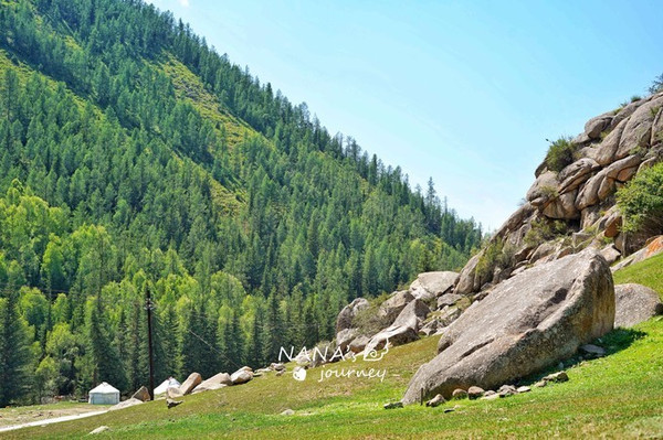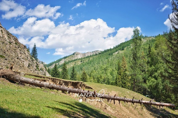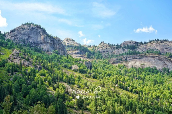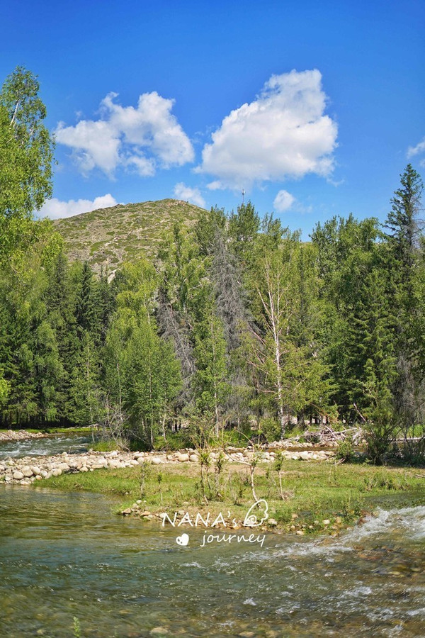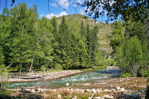 而这片山体位于额尔齐斯河的上游,依附在额尔齐斯河的两侧,一路顺着河流逆行向上,听着水流湍急的声音,很清脆。