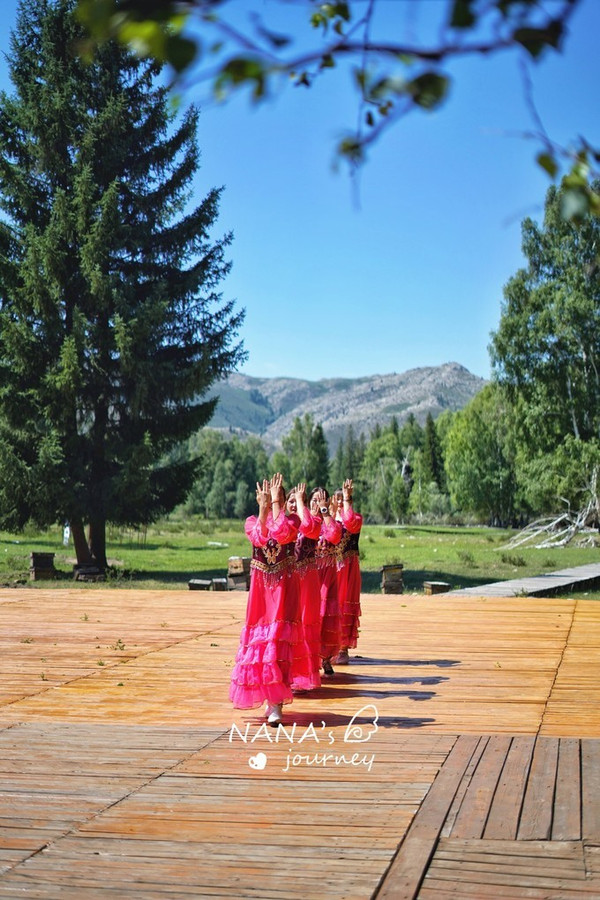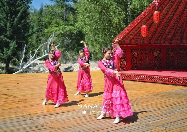 突闻音乐声起,哇,是白桦林的民族表演开始啦!每天在白桦林中的舞台,都有来自哈萨克族妹子们的载歌载舞,他们穿着缤纷的民族服饰,曼妙的舞动身姿,看官们都忍不住一起扭动起来。