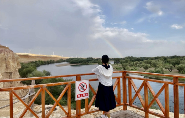 吃饱喝足那就是逛景点咯,也不得不说运气的是,一路的好天气在进景区的时候下起了太阳雨,随后的十分钟竟然又开启了两道彩虹,不得不说如此良辰下的五彩滩更是斑斓,一路向内,竟然连土黄色卫生间的楼上都特别的出境,遇上夕阳西下时光,再与灯塔合个影。