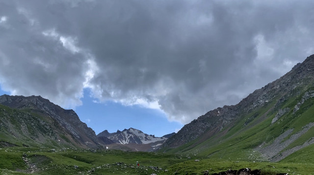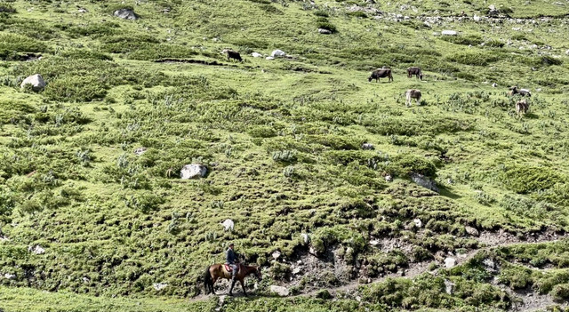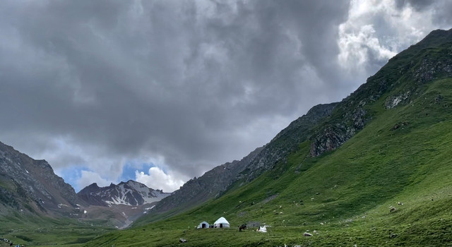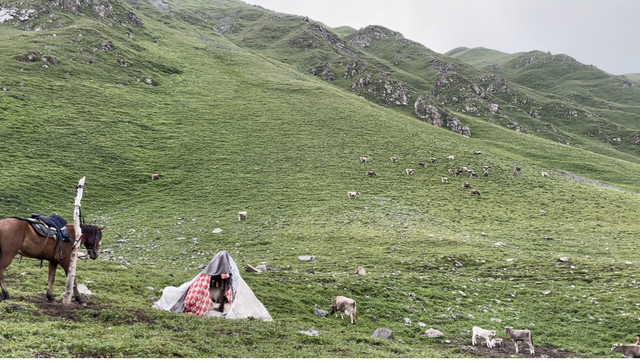 再到游牧人家,还自费了前往雪莲谷,只因为说这儿离雪山最近,于是发现一道湍急的雪山挡在了眼前,而对面就住着一户人家,于是我沿着河流向上,只为寻找到过去的秘密,结果还是湿了鞋,趟了河,天空开始阴霾下雨,主人家忙着生火,赶回牛羊,而我也认识了第三位朋友,一个扳着手指说自己四岁了的小孩,羊羊们跟着她身后,这画面从未见过。