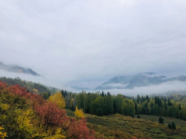 秋色已浓。山顶都是薄薄的白雪,缥缈的云雾游走在山间,白桦树都染了金色,给湿冷的画面加上跳跃的暖色调,层次丰富而绚烂。