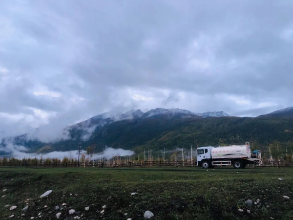 山下多是牧民人家。早晨,村子和山川都笼罩在云雾之中,朦胧如画。牧民的烟囱里升起了炊烟,徐徐升上天空,直至和云雾连成一片,悠远绵长。