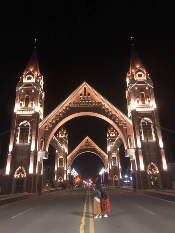 入夜,布尔津的网红大桥颜值最高。俄式的造型配上精心设计的灯光,造型好像童话古堡。