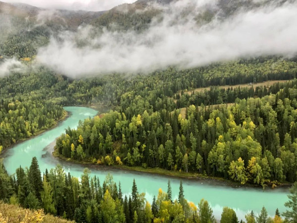 喀纳斯河更是点睛之笔。色如碧玉,像一条玉带缠绕群山。随着河流弯曲蔓延,秋色似乎也跟着流淌起来,延伸到世界尽头。