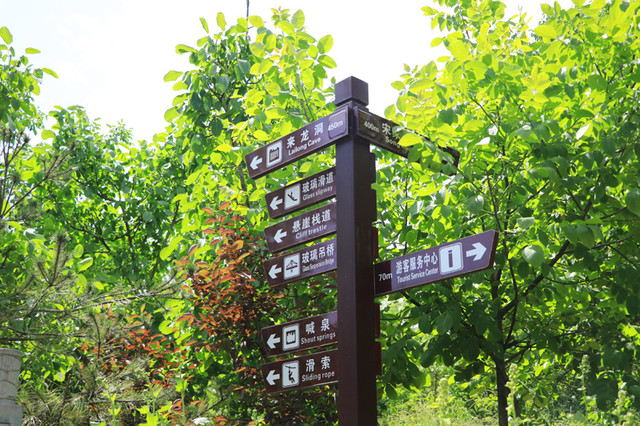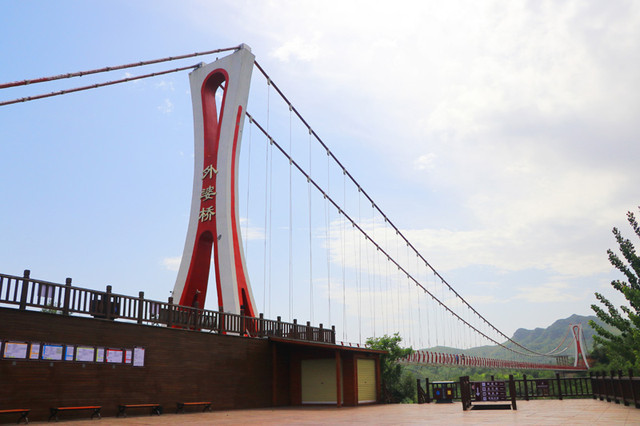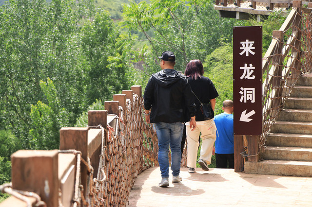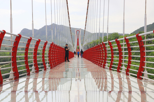 走出来龙洞,沿山路而上,就能看到供游人空中漫步的玻璃吊桥。