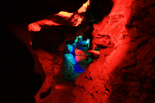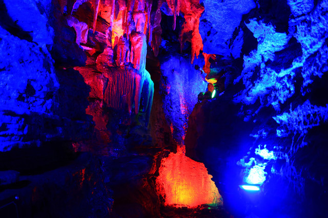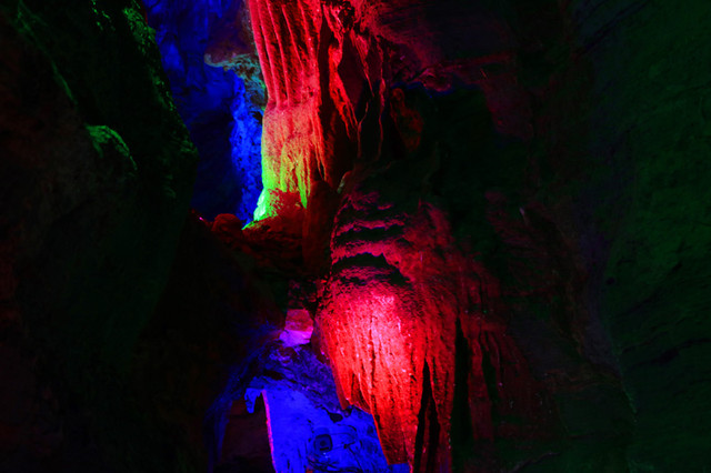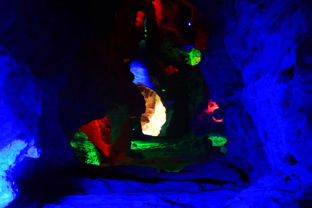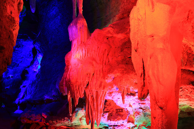 漫步在洞内,只见漫长的溶洞在五彩的灯光照耀下,显得神秘莫测。狭窄之处,仅能一人通过。如果是高大的胖子,通过的时候须小心翼翼,因为一不留神就会被磕住、碰住。