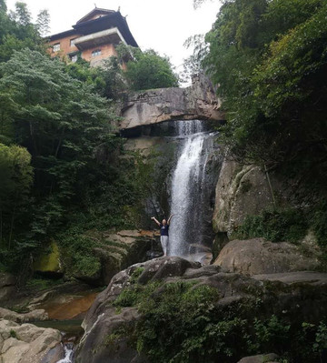 天然石梁横跨在飞瀑之上,得名石梁飞瀑