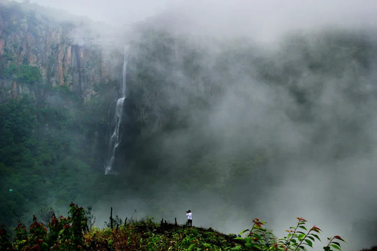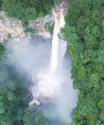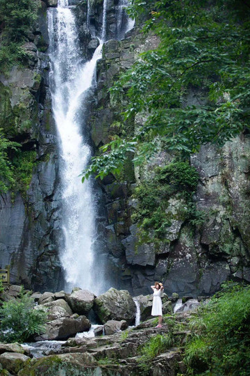 阵阵微风吹过,把瀑布吹的如烟如雾,水花飘落在身上,好像下过蒙蒙细雨,在阳光下光彩夺目。
