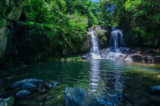 瀑布底有一个彩虹潭,天气好的时候潭底经常挂着超大的彩虹,特别漂亮。潭边有很多超大的石头,大家可以坐下来脱掉鞋子将脚放入潭中泡一下,清凉解暑