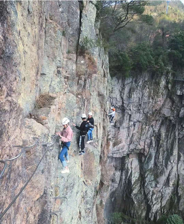 山体两侧分别有玻璃栈道与飞拉达攀岩,都属于刺激项目,胆子小的不建议尝试。我很喜欢他们的攀岩项目,玩起来很有感觉。尤其是飞拉达C线,可以从瀑布下方横穿而过
