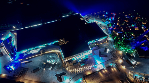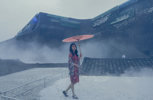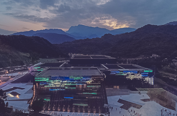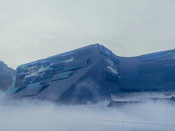 《只有峨眉山》戏剧幻城,创下了好几个“第一”,第一个戏剧幻城,第一个实景村落剧场,第一个卍字舞台等等。单从剧场建筑外立面来说,就运用了50万片灰色陶瓦和彩色玻璃瓦意在勾勒出一幅壮丽浩大的“千里江山图”。真真是大手笔呀!