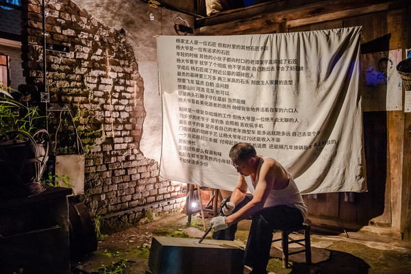 这位石匠,听说他很有追求,他后面的那块布上写着他的故事。