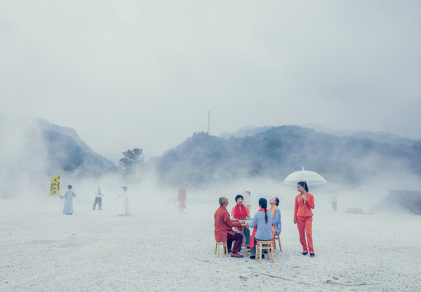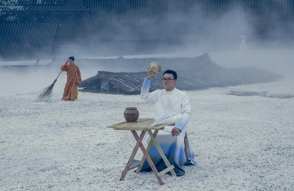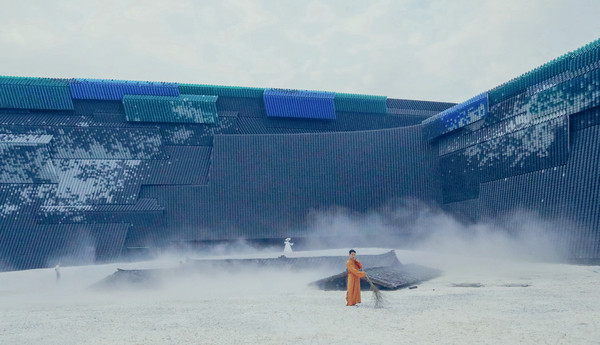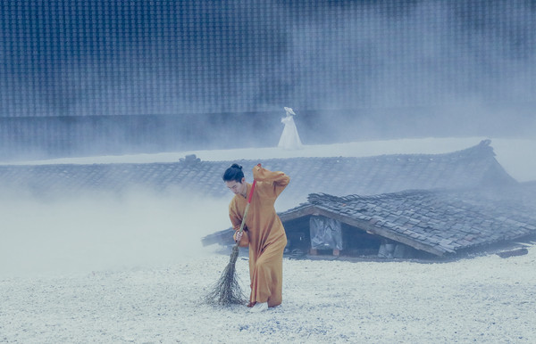 进入剧场,首先是来到“云之中”,云之中是一片开放的剧场,仿佛仙境。一大片的白色砾石里安装了雾森装置,整个剧场被云雾覆盖,王导是把峨眉山上的云海都搬到了剧场吧。