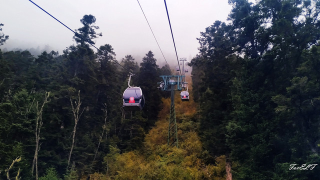 坐着缆车,4分钟瞬间上山。从缆车站到景点还需要走一段山林木栈道,慢慢往前走,呼吸着森林潮湿的空气,舒服,对我们应该算是走在雾里,周围悬浮着小水滴,对山下的人应该算是走在云中。