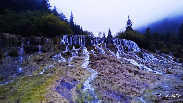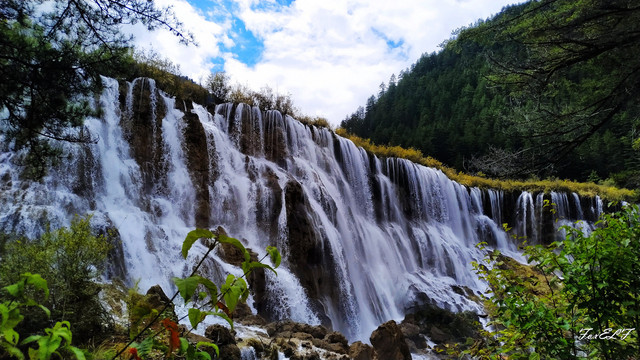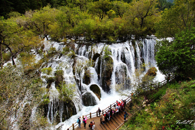 珍珠滩瀑布,海拔2445米,瀑布高21米,宽162米,是九寨沟内一个典型的组合景观,是电视剧《西游记》片头中,唐僧师徒牵马涉水的地方。珍珠滩瀑布,如银河天降,气势磅礴,在山谷中发出惊天动地的轰鸣声,气势非凡。宽阔的瀑布冲进谷底,咆哮如雷,卷出千堆浪花,在翠谷中涌起水雾,既而向东狂奔而去,水声雷动,山涧沸腾,气势磅礴。