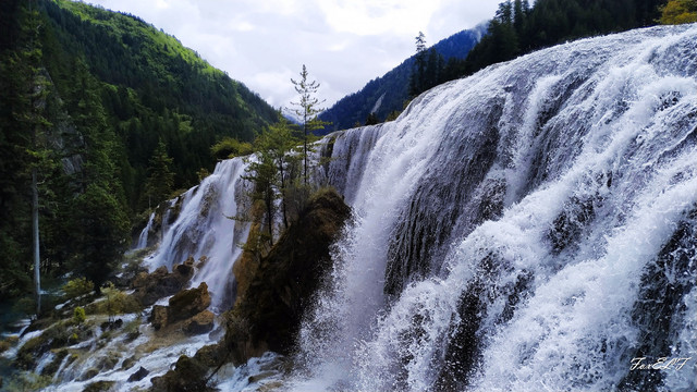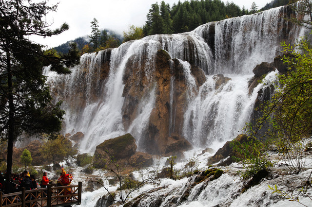 珍珠滩,珍珠滩位于日则沟和南日沟的交界处,海拔2433m,为一扇形钙华滩流,是九寨沟绝景之一。珍珠滩是九寨沟众多海子中一个较为宽阔的石头滩面,清澈的湖水经过宽敞的滩面奔流而下,湖水在倾斜而凸凹不平的石头滩面上溅起粒粒银珠,形似珍珠,珍珠滩之名由此而来。人太多,太阳在那一刹也出来了,就变得相当晃眼。