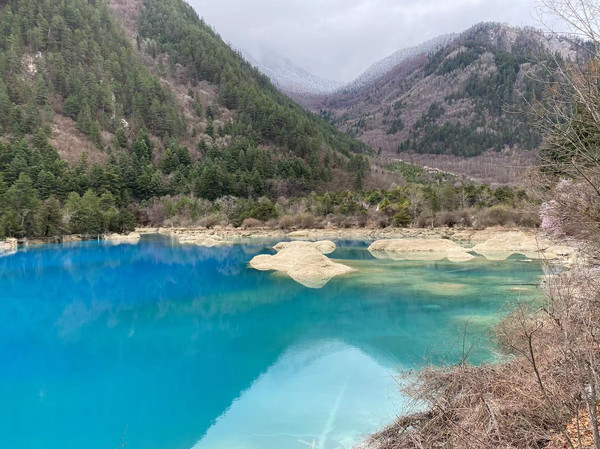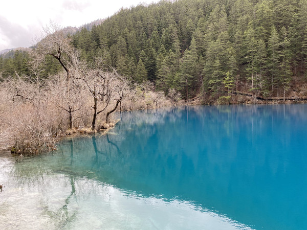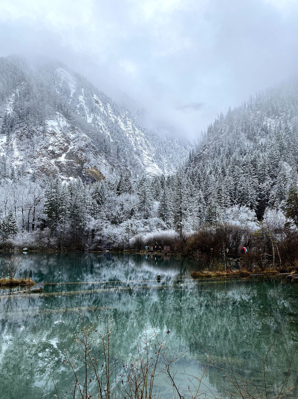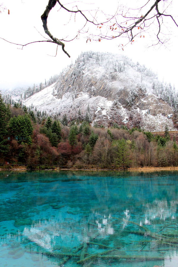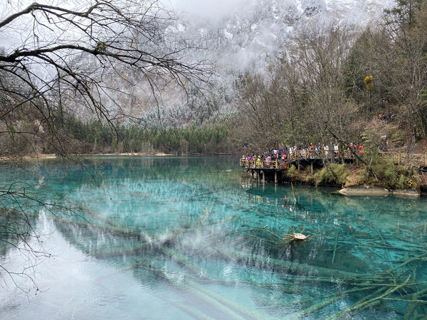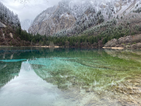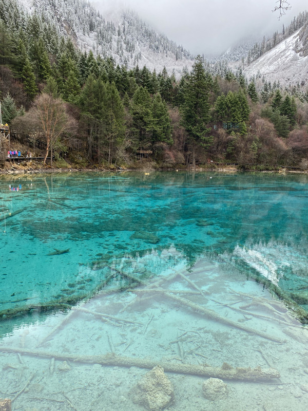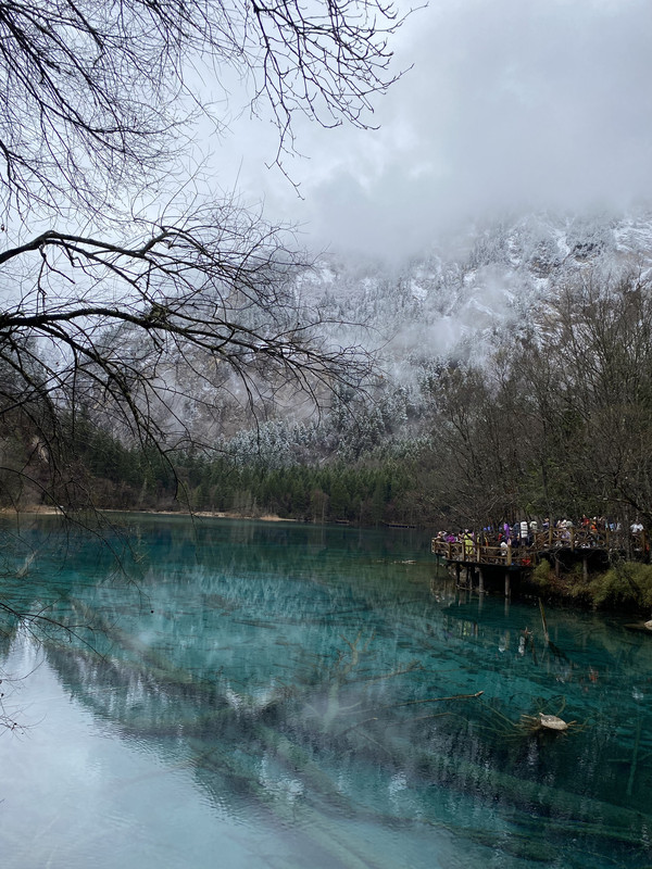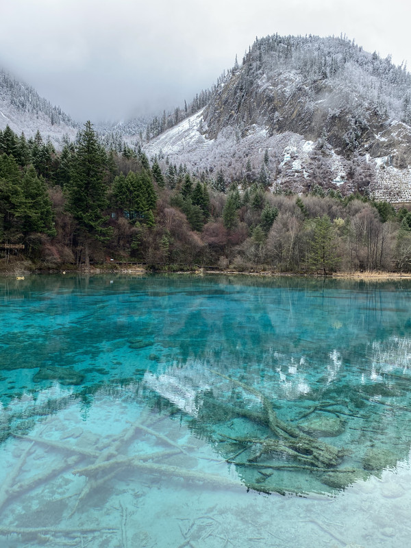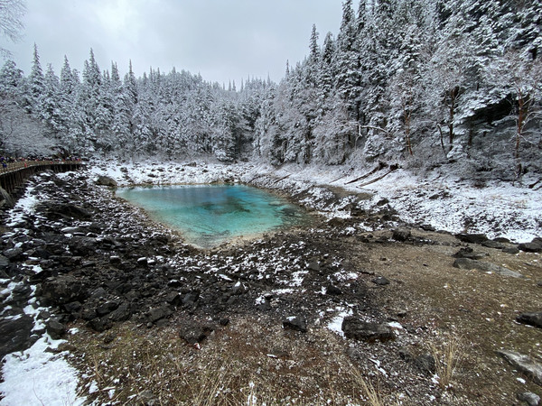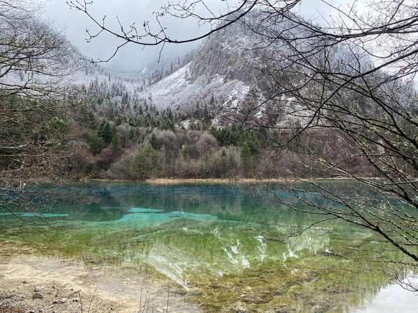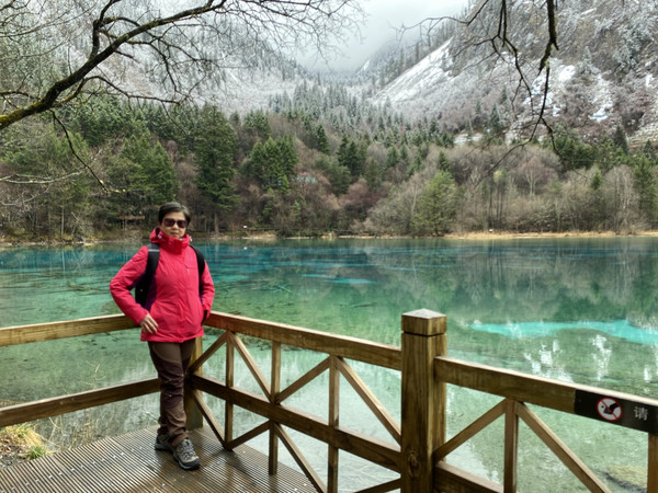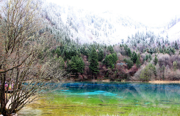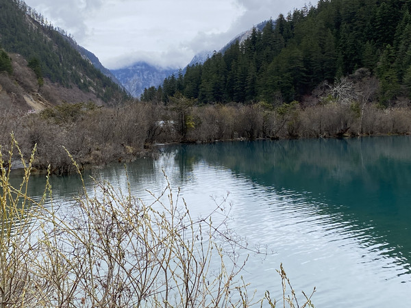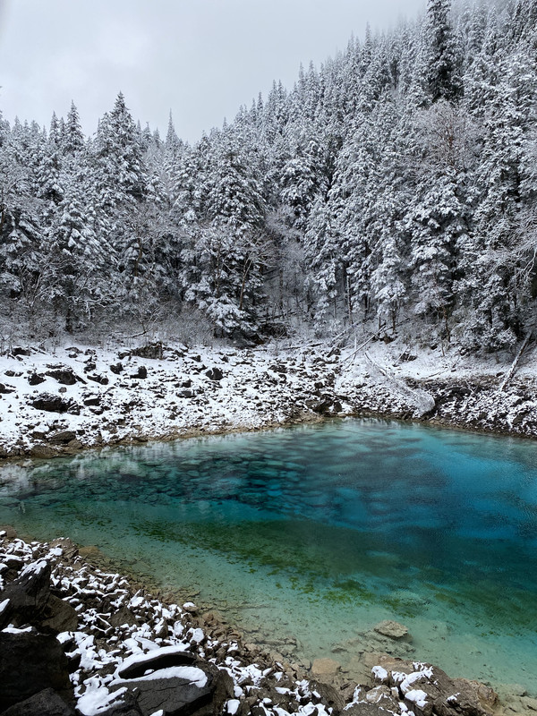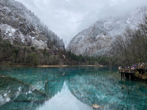 我们到达五花海时,天作美,雪止了。虽然天空依然乌云密布,但五花海还是美的令人窒息!