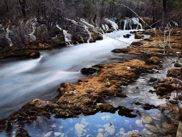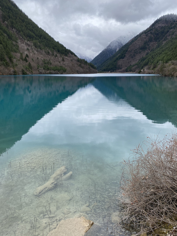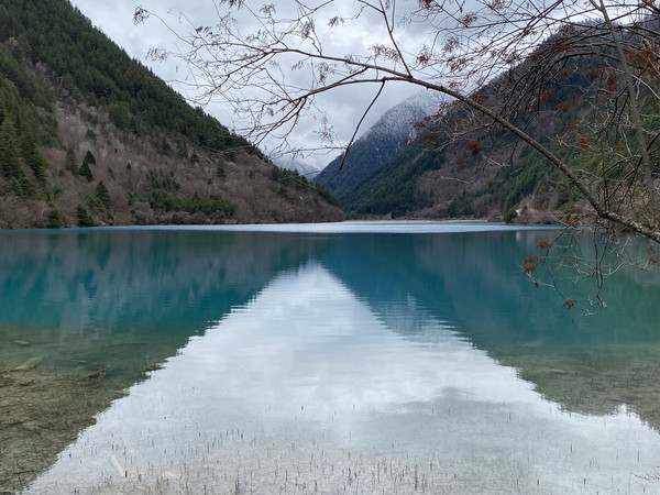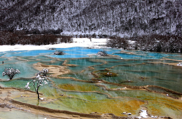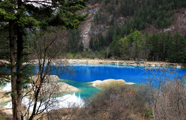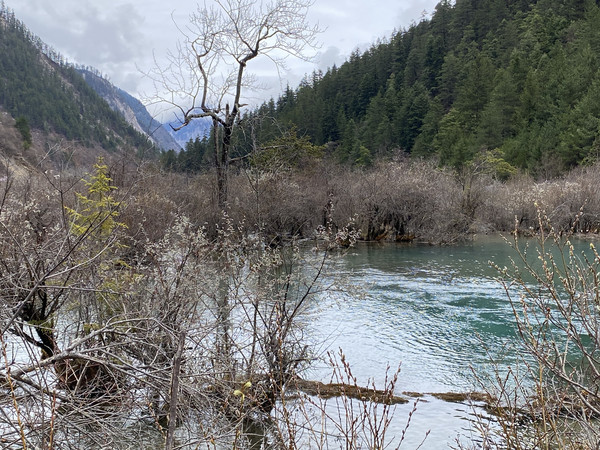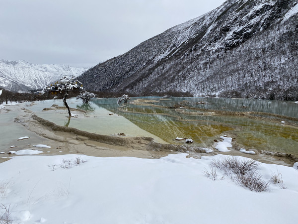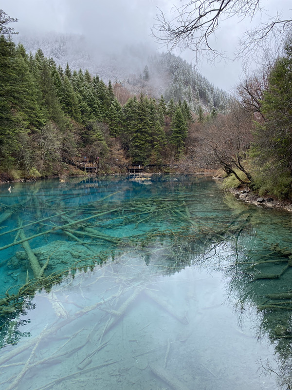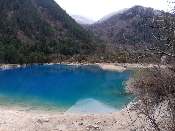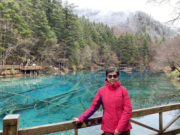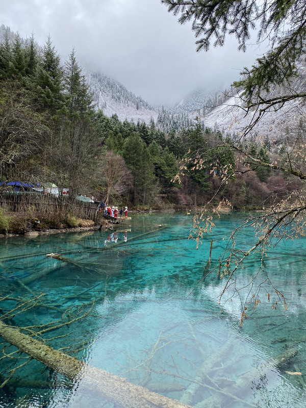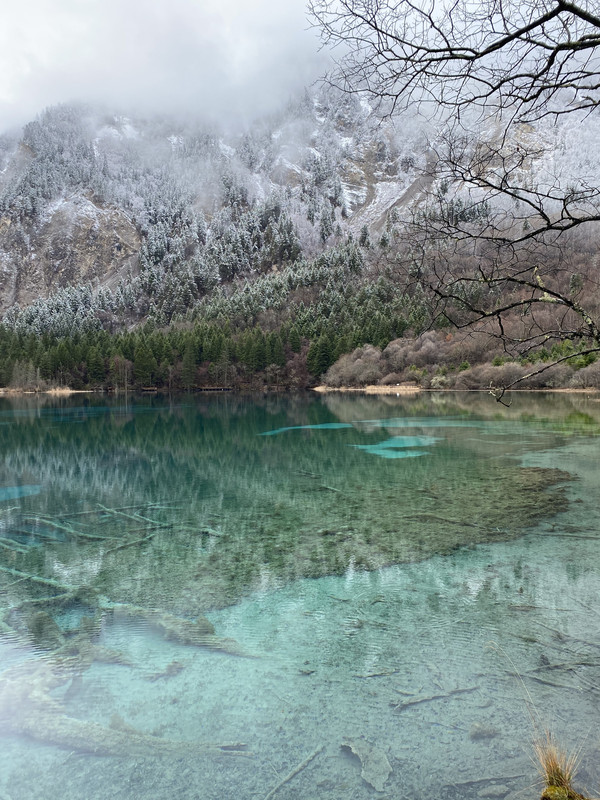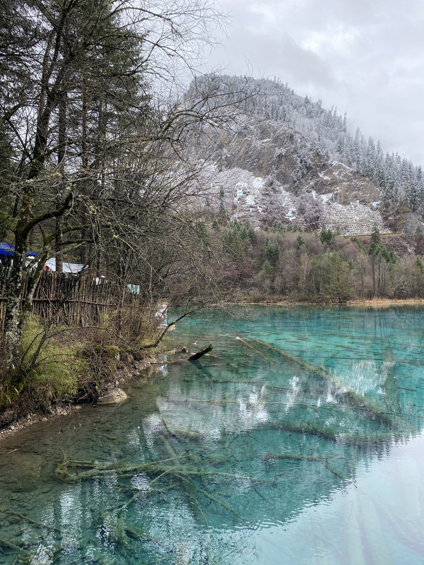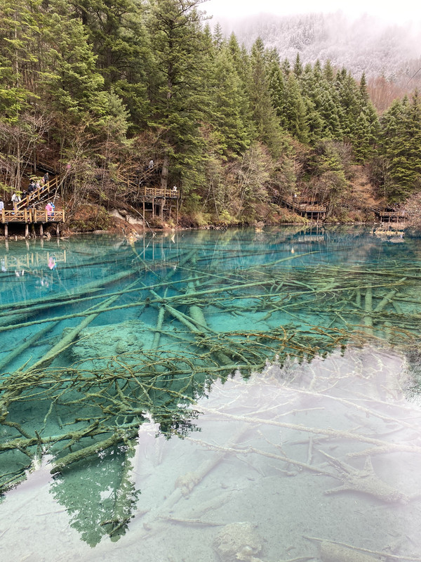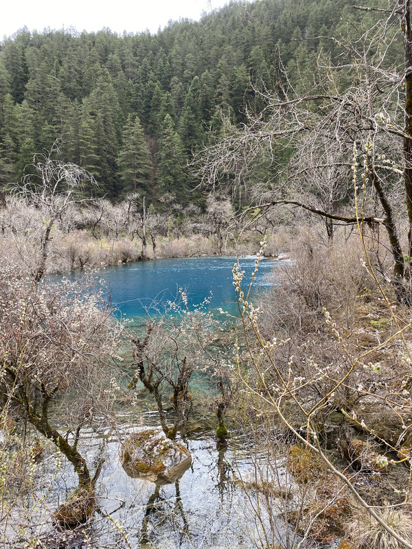 我们到达五花海时,天作美,雪止了。虽然天空依然乌云密布,但五花海还是美的令人窒息!