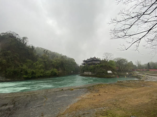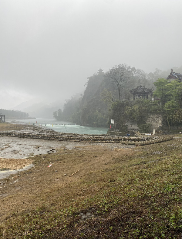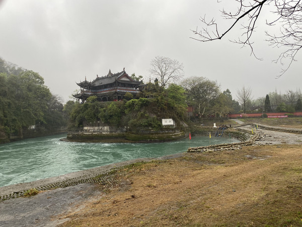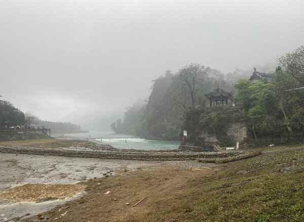 在此远观,迷雾中可看岷江水奔流而来,弯道转入宝瓶口,自然景色十分迷人。