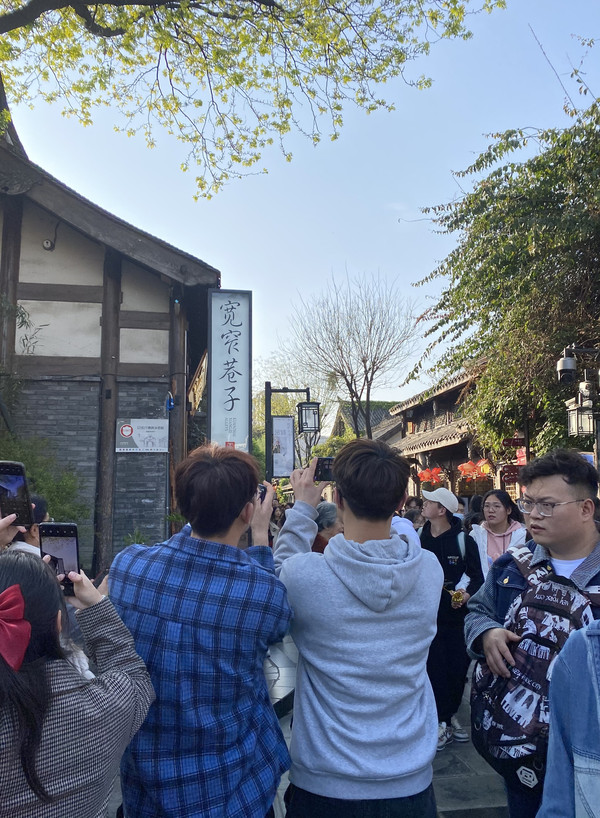 宽巷子口,游人如织,穿梭于宽窄巷子之间。