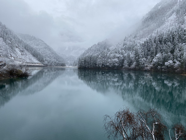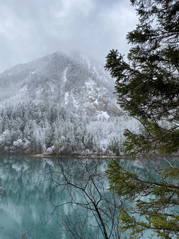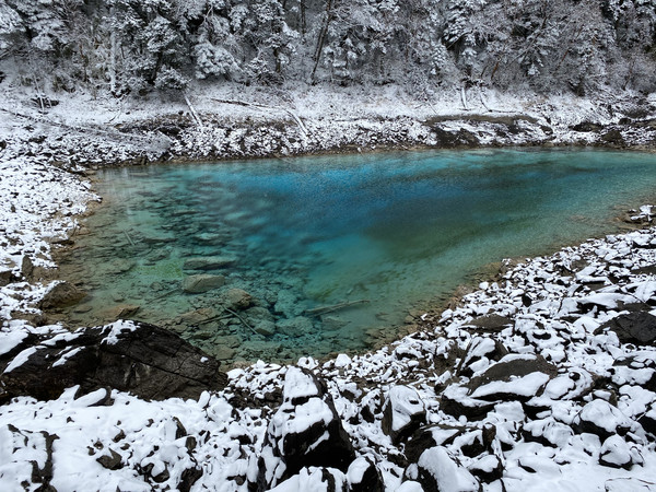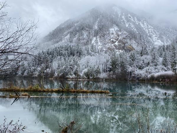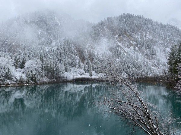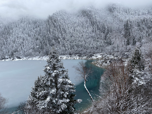 今日虽无蓝天白云,但有覆盖在翠林中的层次丰富的白雪,使得眼前的海子更具魅力!
