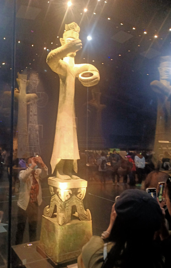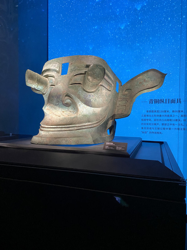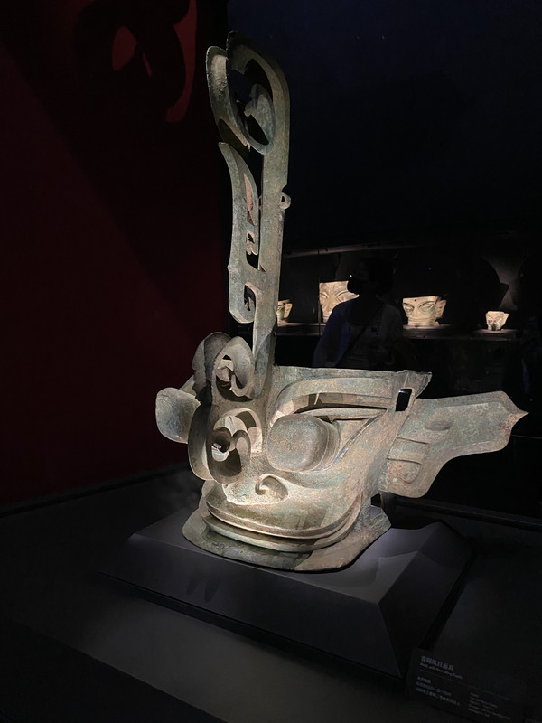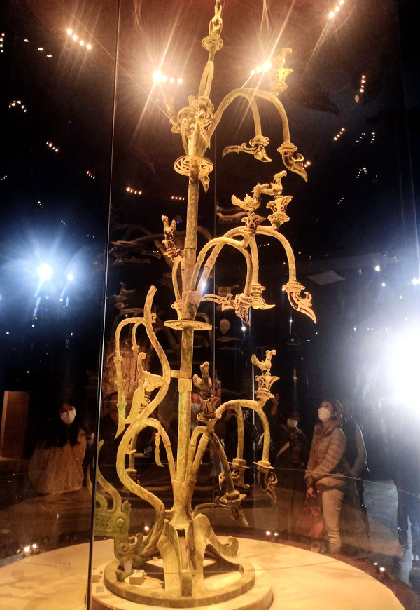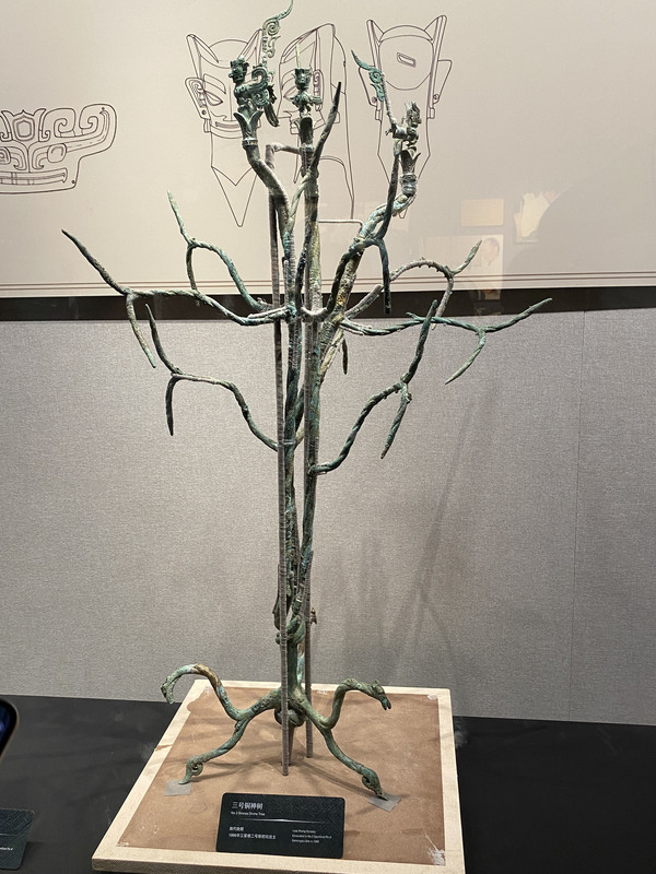 综合馆内的商青铜神树!三星堆遗址共发掘出6棵青铜神树,其中最完整的是1986年在二号祭祀坑出土的“一号神树”,它高3.96米,是中国现存最大的单件青铜文物。它是古蜀文明的代表,可谓青铜铸造工艺的集大成者,是古蜀先民人神互通的神话意识形象化的写照,2002年1月被国家文物局列入《首批禁止出国(境)展览文物目录》。
