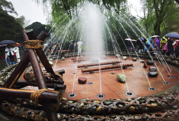 上图左边的原木三脚架被称为“闭水三脚”,亦称杩槎。常用于截流、防洪、调剂水量、围堤抢险等,其是功效极高的治水工程设施之一;地上的竹制笼子内放卵石被称为”竹篓“,亦称竹笼。在李冰创建都江堰时,就采用此笼石之法,工程简易,费省效大。此法千古流传,至今在防洪抢险时仍被广泛采用;中间四根铁棍被称为“卧铁”,是埋在内江“凤栖窝”处的淘滩标准,也是内江每年维修清淘河床深浅的标志。相传李冰建堰时在内江河床下埋有石马,作为每年淘滩深度的标准,后来演变为卧铁。现有四根分别是明朝万历四年、清同治三年、民国十六年和1994年埋下的卧铁,还在内江河床之下起着作用。