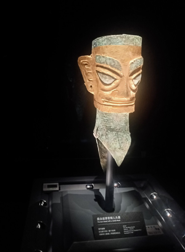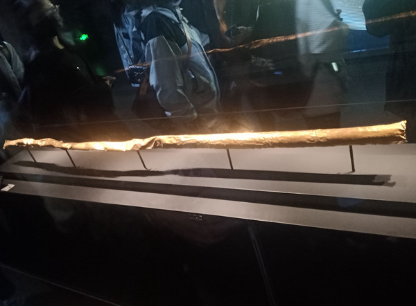 综合馆内的商金杖!此文物为商代的金器,金杖系用金条捶打成金皮后,再包卷在木杖上;在金杖一端,有一段图案,图案共分三组:靠近端头的一组,合拢看为两个前后对称,头戴五齿巫冠,耳饰三角形耳坠的人头像。另外两组图案相同,其上下方分别皆是两背相对的鸟与鱼。