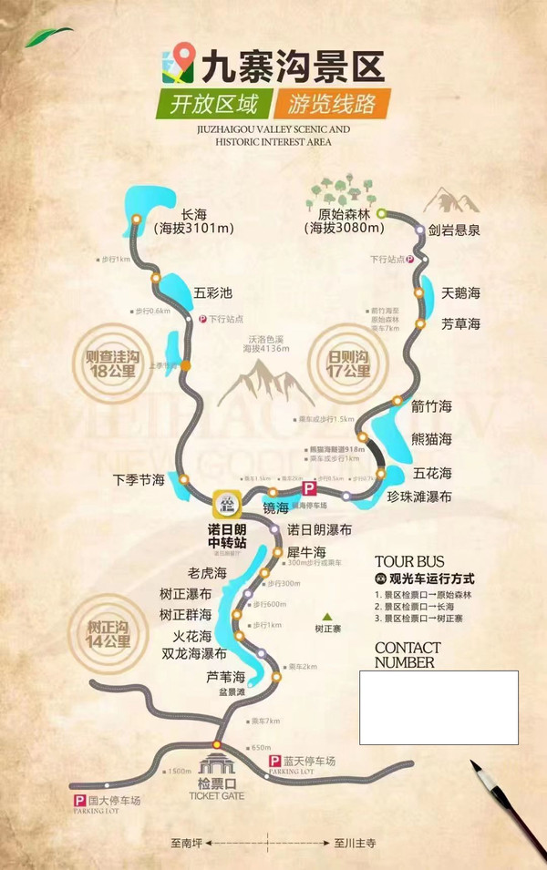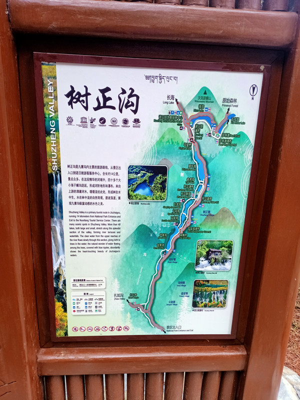早上八点四十八分,我们到达九寨沟景区大门。上图是九寨沟景区的Y型游览图,我们乘坐景区公交(购买门票进入景区,乘车就不需另外购票了)去各处景点游览的线路是:从九寨沟景区大门乘车至诺日朗中转站换乘右线公交直达箭竹海并游览----乘车至熊猫海并游览----乘车至五花海并游览----步行至珍珠滩并游览----步行至珍珠滩瀑布并游览----过镜海(解决午餐)----步行至诺日朗中转站乘左线公交至长海并游览----步行至五彩池并游览----乘车至诺日朗中转站----游览诺日朗瀑布----乘车至犀牛海并游览----步行至老虎海并游览----步行至树正瀑布并游览----步行至树正群海并游览----乘车至火花海并游览----步行至双龙海及双龙海瀑布并游览----乘车至盆景滩并游览----乘车返回九寨沟大门出入处。